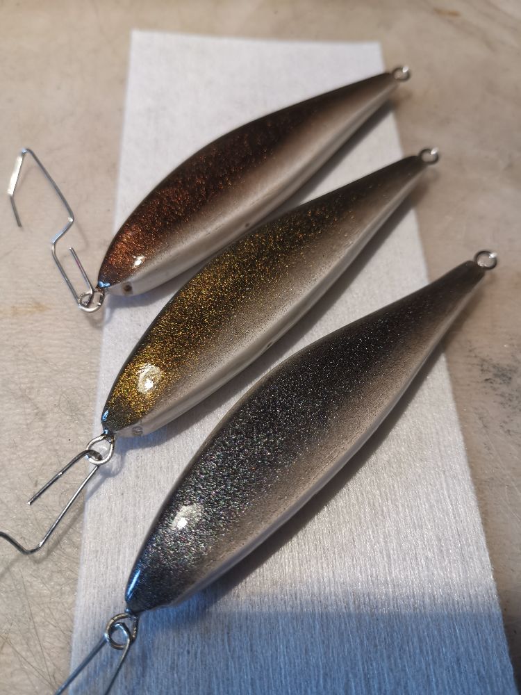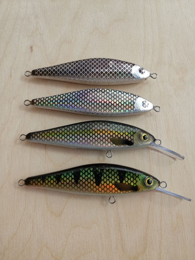 Абаши, 90мм 12грамм. Две версии с увеличенным заглублением и одна "простая", почти твичевая. Играют хорошо, бодро ныряют и медленно всплывают. Кладу плёнку на разные "базы". Хочу понять, на каких цветах плёнка будет хорошо выглядеть.