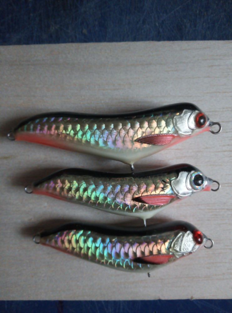 Взялся за просьбу изготовить воблер для бОльших глубин. Что бы не придумывать велосипед, изготовил "копию" рапалы. Воблеры из абаши. С шумовой камерой. Всплывают на паузах. На сколько ныряют не замерял, но больше 2,5 метра точно.