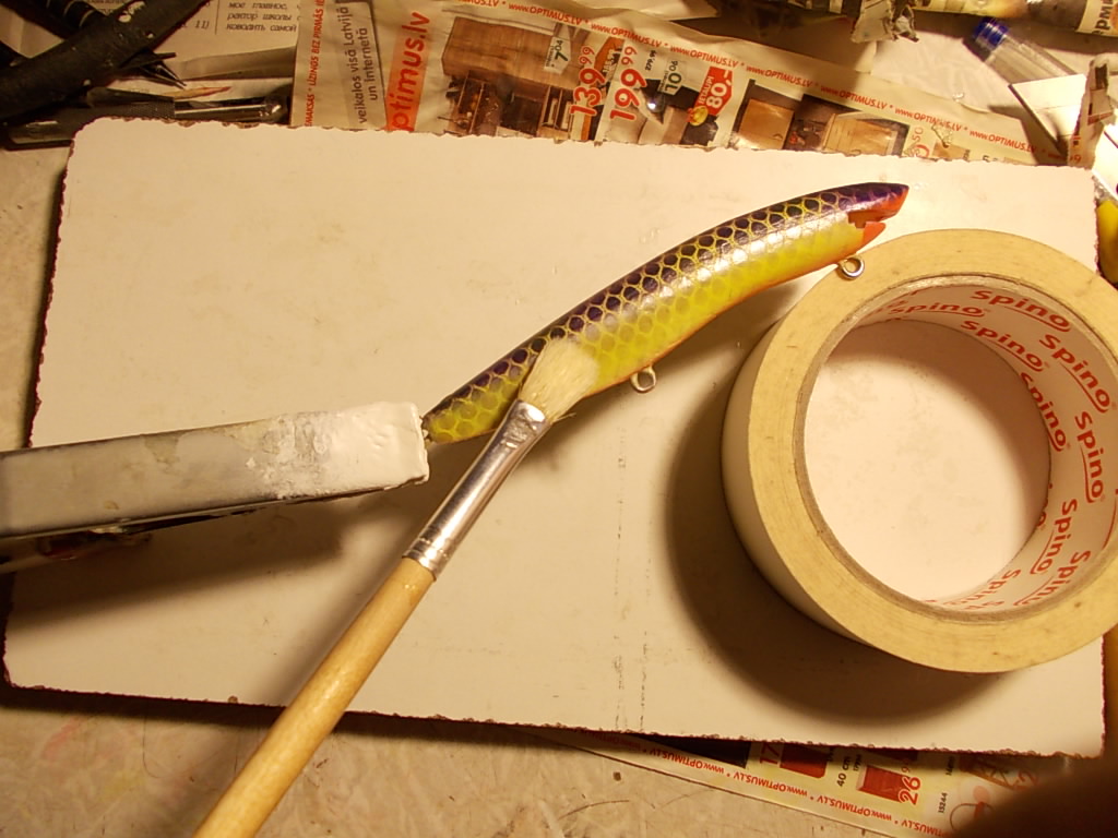вот тут вопросик. по моему опыту, кистью надо работать с нажимом, несколько раз проходя каждое место поверхности. А иначе появляются непрокрашенные пятна.Stekloduv писал(а):Воблер опирается двумя точками, поэтому смело мажем его кисточкой, но чем меньше будем елозить по нему кистью -тем лучше...