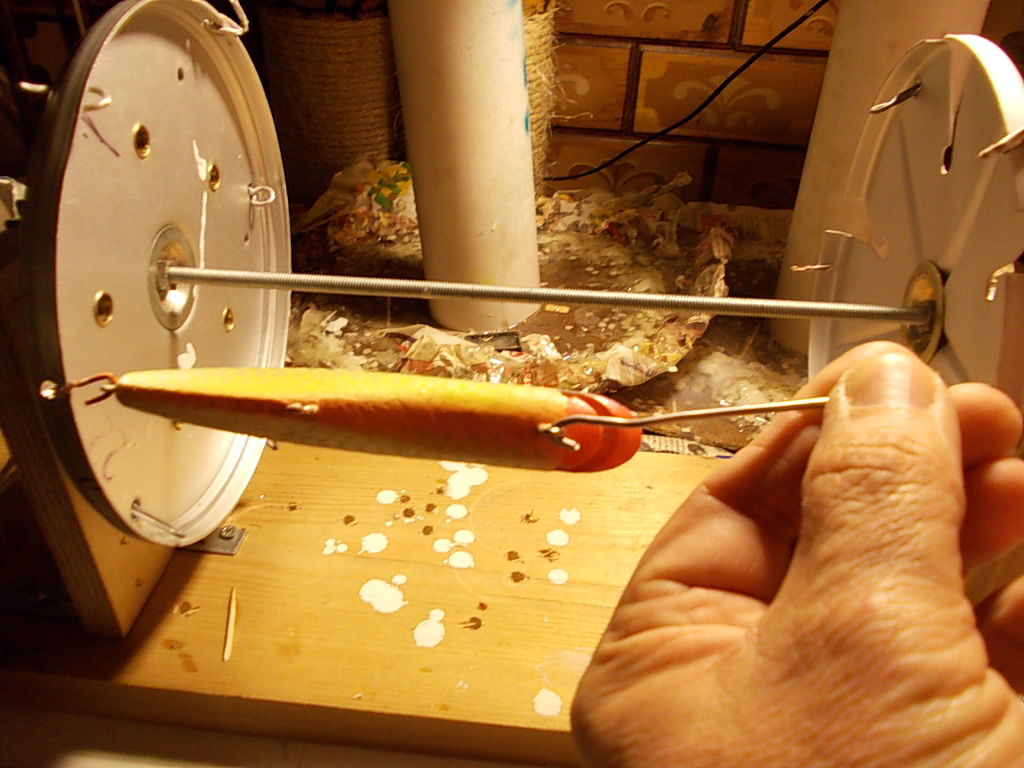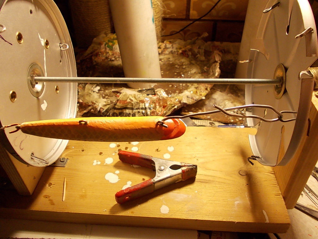 Воблер опирается двумя точками, поэтому смело мажем его кисточкой, но чем меньше будем елозить по нему кистью -тем лучше... Когда намажем, берём за среднию петельку и цепляем за крючок одной петелькой.... теперь я беру мягкую проволоку (медь, алюминий...) и цепляю за противоположное колечко воблера, делаю натяжку за проволоку и отнимаю зажим, теперь воблер поддерживается натянутой проволокой, которую держу в руке...пальцами