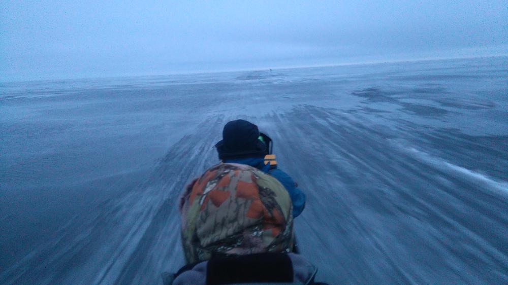 Первый выезд в пятницу. через пару километров от берега натыкаемся на трещину, довольно внушительную. Ищем проход медленно перебираемся. И уходим в далёкий поиск..