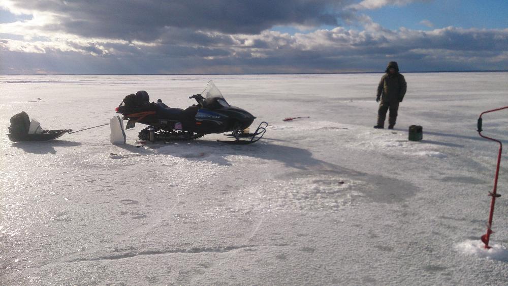 Утро, суета, опять суета и снова она же.... Дорога, собственно тоже без изменений. Дислокацию ловли на этот раз сменили на ту, где давеча хорошо отрыбачился Саша Сав. Прибыли, место слегка изменилось в связи с выпавшим ночью снегом. Сашка ищет свои вчерашние дырки, но не может найти, хотя место именно то, и отчаявшись начинает дырявить новые, качая наобум и у него это не плохо получается. Я опять не совсем в струе. Там шкрябну, сям вытащу, но не более трёх из одной лунки, да ещё меж них до пяти пустых лунок нужно насверлить. Когда нашёл заветную с семью рыбами к ряду и парой сходов, уже слышен был гул от снежиков, то летели Фил и Янка для изъятия наших бренных тел от рыбных мест с последующим препровождением до берега. Последнюю лунку мне даже проверить не удалось. Короче, у меня баловство оно, а не рыбалка получилось. Ребята же - напротив чёто там накачали и словили. Рыбу ведь ловить не трудно, но сцуко уметь надо....