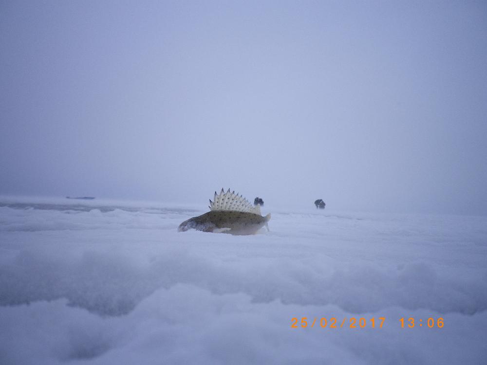 Про трещину уже трещали выше, по этому пропустим. Короче прибыли в место "Х" и расползлись по приглянувшимся индивидуально каждому местам. Рыбу нашёл на десятой лунке. Не скажу, что шкрябал исключительно крупняк, но вполне берибельный бахчевик с бонусами вперемешку. Приятный короче размерчик. Накачал более трёх десятков. Рыба опять в супе, чаще на двух метрах выше дна. Клёв сошёл на нет после подъёма последнего грамм на сто пятьдесят. Изловив сей девайс, понял, что это был завершающий в стае и уже было не хотел опускать баланс, но для качества эксперимента всё же макнул. Моё предположение оказалось правильным. Дырканул ещё с пяток лунок на удалении. В каждой что то достал, а вот одна опять стрельнула. Ещё под пять десятков насшибал как в рот. Только горизонты меняй и тяни. Были и пустые моменты. Приходилось проверять старые дырочки и досверливать новые. Правда увеличение отверстий никак не влияло на поступление рыбы в закрома Родины.