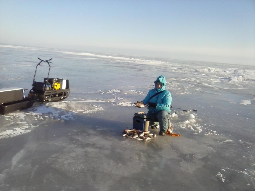 Раз за разом перемещались,сверлились,а успевали только поймать по паре отставших от стайки.Так потихоньку и прошел день. Денек же был заглядение,даже первый раз в этом году понадобились солнечные очки.Довольные и загоревшие,вечером попивая чаек ,решаем в субботу половить плоточку,тем более уже несколько лет не попадали на подледную. Утром выспавшись,не спеша двинулись за серебристой красавицей. Поехали в озеро наугад,миновав основную массу рыбаков, остались одни. Посверлившись там-сям,увидели перспективное местечко.Опустив мормышки сразу поймали по плоточке. И Всеее