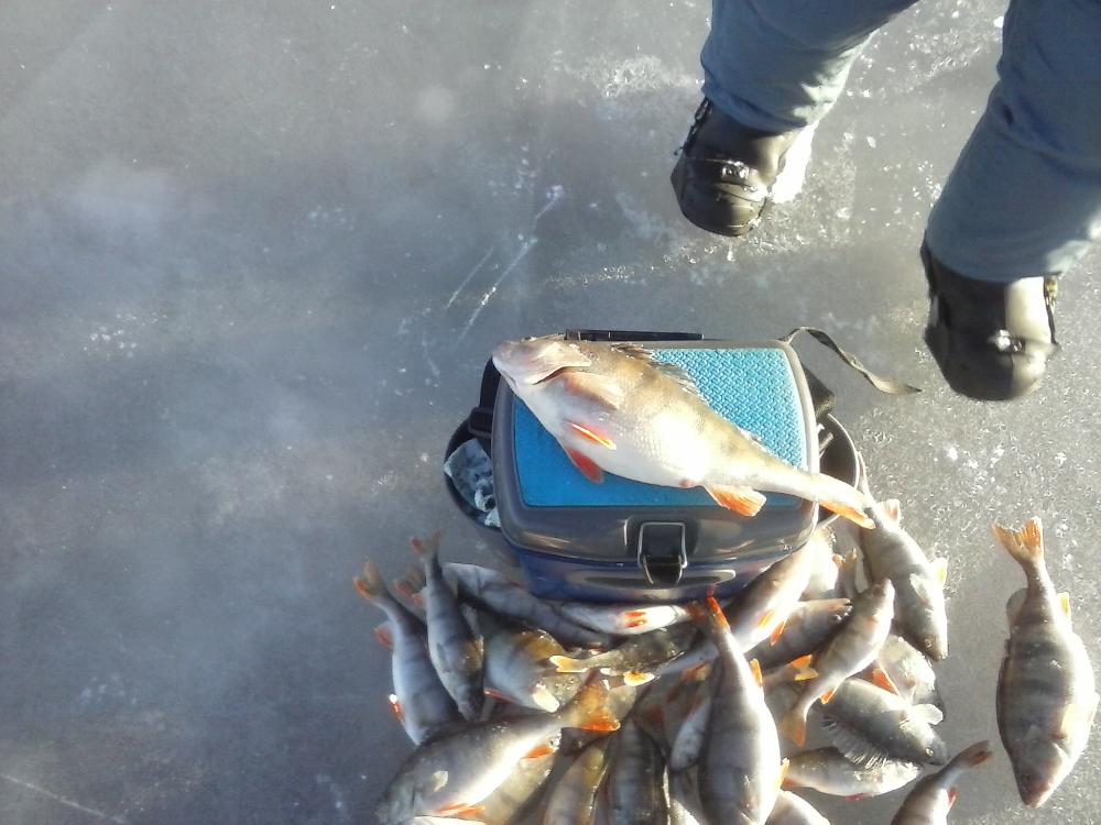 Прилетели утром, а там уже папуас на дежурстве. Потом ещё один подтянулся, тоже вчерашний. Там сям сверлился не приближаясь к местечковым, озеро то большое. Место определено, нужно только искать. Там плотва, сям пара окуней. Ещё один через три лунки. Янис на вчерашних дырках взял лишь одного полосатого и опять засобирался в даль далющую. Я решил не скакать кузнечиком, мой максимум на третий день рыбалки из - за болящих мышц, давал возможность только ползать как цикады. Пришлось культурно отказаться от предложения погоняв - поискать и остаться, тем более, что ловить собирались лишь до 12 по полудню. Побродил и всё таки набрёл на своё, козырное место, почти иридиевый унитазик. Окунь пёр как из рога изобилия. Ловил я на Вадькину секуху, подаренную мне на день рождения. Впайка крючков лишь с ниткой, никакой подсадки. (Вадька привет и огромное спасибо!). То в лёт, то чуть раскачать нужно, но хавал окунь постоянно. В принципе работало пять лунок, но в основном две. Подо льдом на линзе стаи снетка черябкаются, руку регулярно прижимает окунь в глубине, на сторожок можно было не смотреть, а после лесочка попискивая тянется с натугой, красота! Жаль только время очень быстро пролетело. Слишком короток последний день перед отъездом. Янису конечно позвонил и он чутка успел поймать. Местечковый люд, как оказалось, не был испорчен манерами как я и подтянулся на запах рыбы валявшейся на льду гораздо ближе самых допустимых даже не джентельменами придуманных норм приличия. Хотя на меня по началу зыркали вовсе не по доброму, пусть я и находился в полусотне метров от них. Но мне не жалко, им то рыба нужнее. Им вон до берега десять км. пилить на буранах, только в темноте и доберутся, не то что нам с Янкой - четыре часика и мы дома!