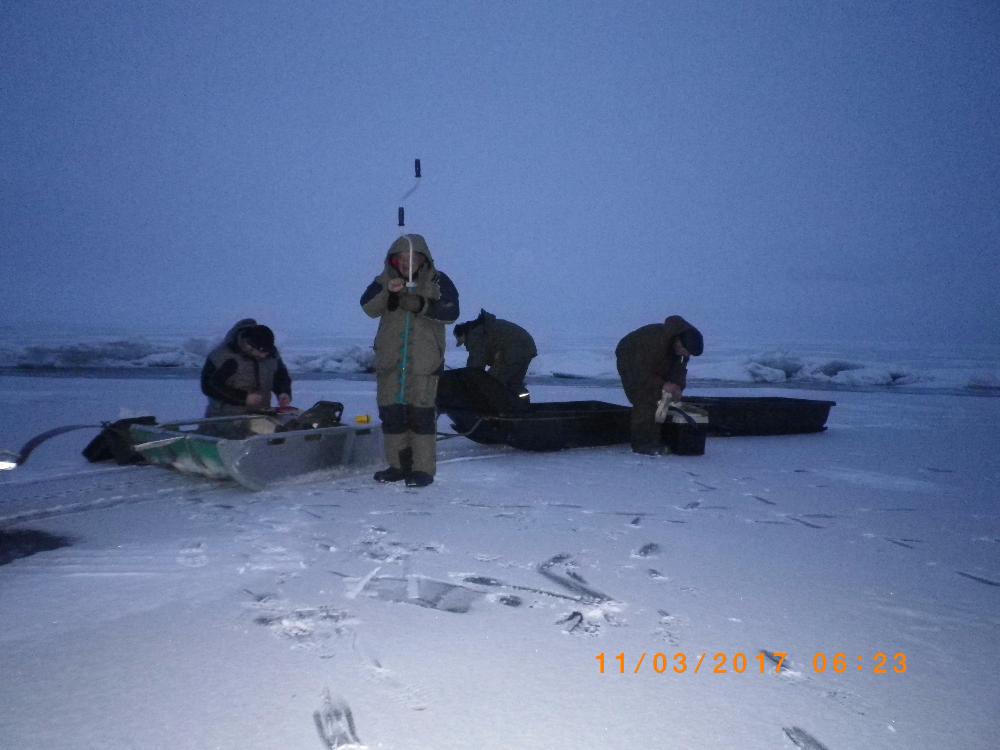 . Но, всё улажено и в заранее запланированное время тремя санками стартуем в озеро. Везли нас на какие то точки, которые пришлось определять(переводить) из одной системы координат в другую. Ехали не очень долго, но прибыли первыми. По пути как правил форсирование трещин. Сразу рассредоточились.