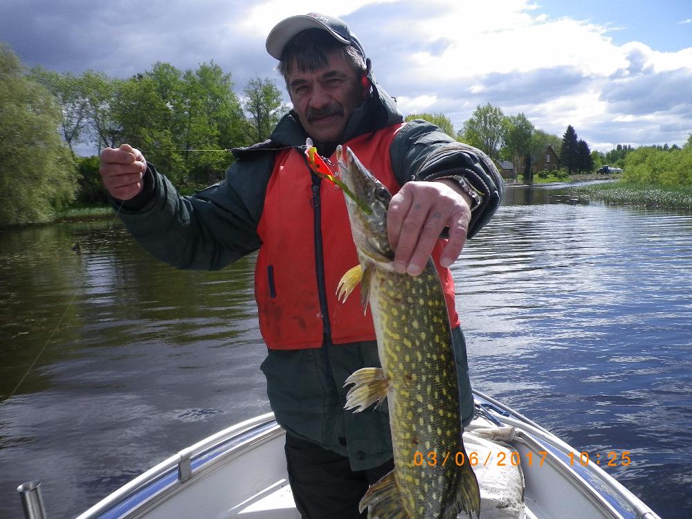И рыбу там искали озёрную, ну в смысле зашедшую с большого озера. С утра даже что то нащупали в одном уголке. пять штучек отпустили, и одна съедобная атаковала прямо у лодки, стремительно так, с вылетом. Но не зацепилась. Какая то надежда всё же была на бОльший успех. Другое перспективное некогда место промолчало вообще, кроме одного прозрачного шнурочка. Вернулись в уловистый уголок, в надежде сманить ту щучку, что глаза показала. Сане это удалось. При детальном осмотре выяснилось, что это именно она. У неё зубов не хватало, кои она потеряла об мою вертуху в прошлую атаку. Дёсны ещё даже кровоточили