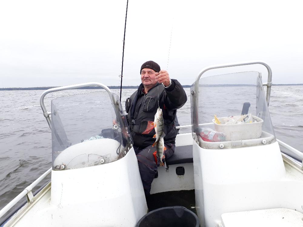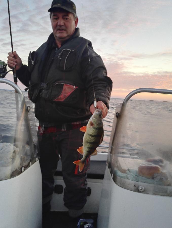 В щадящем режиме дошлёпали до точки , рыбка тоже присутствовала , пару раз приходилось переставится , всеж волна стаскивала с места , предложил Борику за крупнячком , но вроде и тут проклёвывался не плохой окушарик, так и ловили до обеда на одном месте .