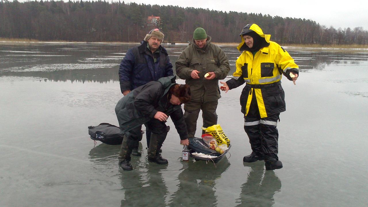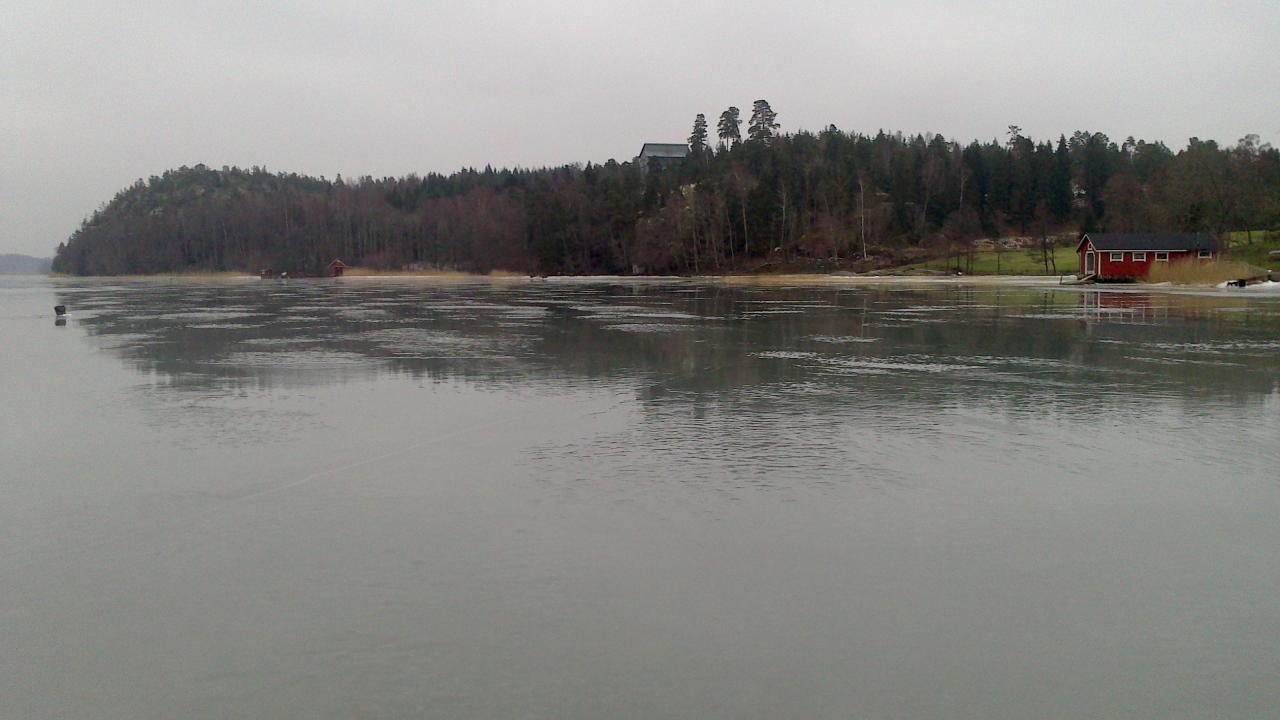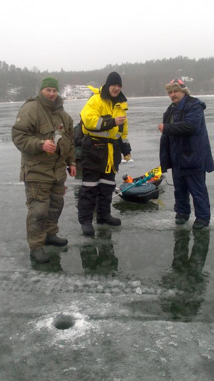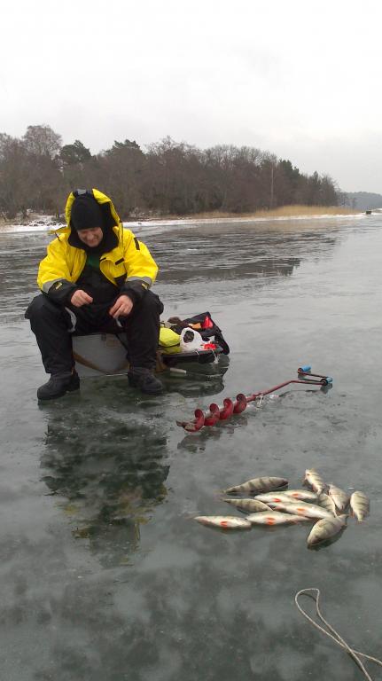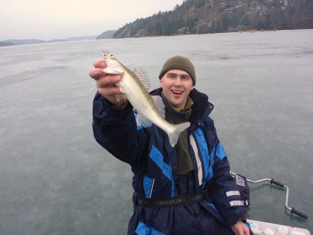 Выйдя на гладкий лед, покрытый слоем водички, мы ощутили реальную силу ветерка и пошли ловить в противоположном направлении, около острово Hjortoholmen, чтобы попробовать укрыться от ветра за скалой на противоположном берегу. Кажется, у нас это неплохо вышло и прикрыв лунку ящиком и ногами, удавалось делать неплоху проводку. Но, видимо, погодка клеву не способствовала и утренние часы прошли за бесклевьем. Ближе к обеду окунь таки проснулся, но откликался только на мотыля, которого у нас было более чем достаточно.