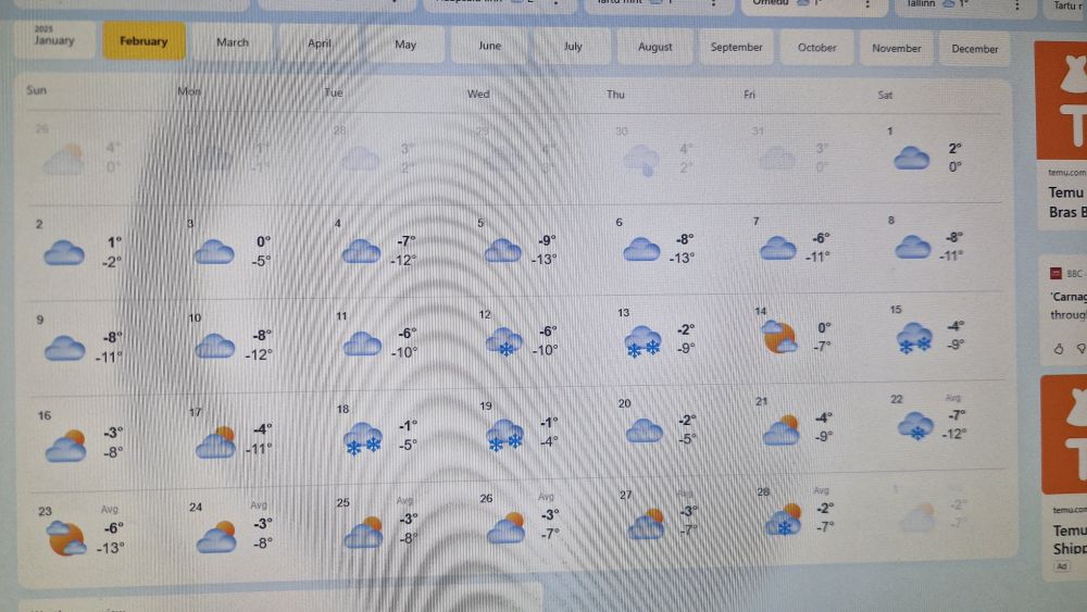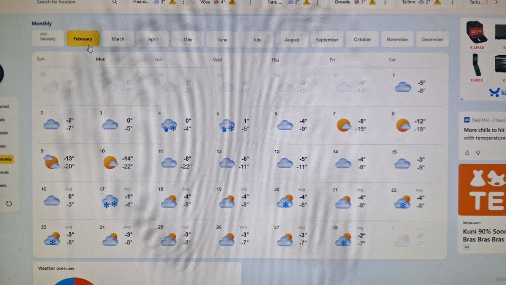 Хочу дажке в середине. Но это ещё вилами по воде писано. С конца января и по всему февралю мороз пока обещают, по всей Эстонии. Омуду так под -22.