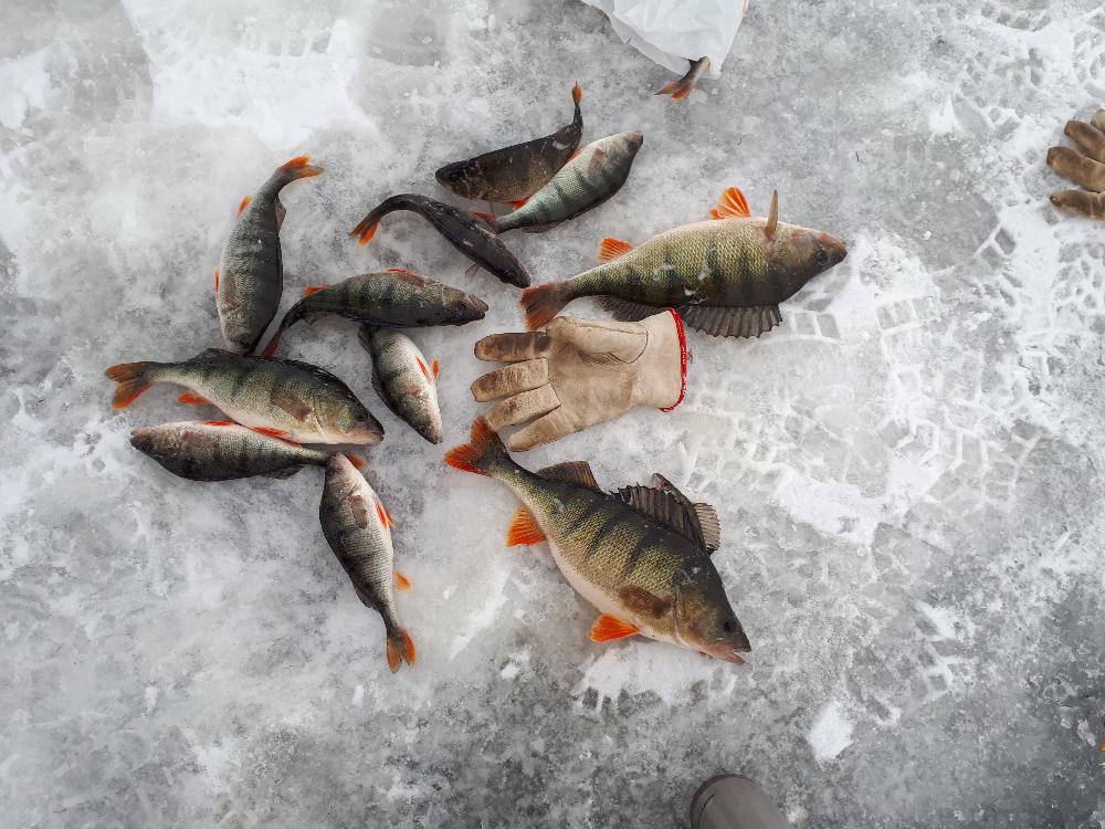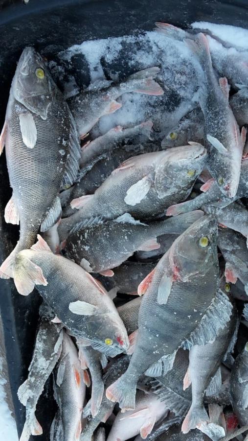 Немного оптимизму перед выходными. Сегодня отвезли меня на 3 км Калласте.По снегу комфортно идти только по следам от техники.Рыб клевал с утра и до 3 дня.Очень радовал размер окуня.Мелких попалось штук 20 только.Соседи отловились похуже(сидели на одних лунках.)