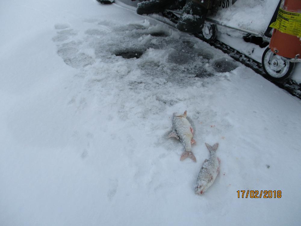 17.18 выход с казепа. Cнежка добавилась и лёд подрос, начал поиск с 12 км . Окунь молча наблюдал за полосканием железа, только изредка катались матросики. К 14 часам бурится больше не было сил да и смысла в это время я был уже на 8 км, сел на мормышку плотка отозвалась сразу. На второй день едем сразу на 8 км, рыб начал брать с 10 и на опускание. В 11 завтрак был окончен и клёв стал размеренный на удивление 30% был окунь, размер от 150-500 и зачем я первый день бегал с железяками. Из моих 6 рыболеев бонусные подарки были у каждого, кто сидел на морышке. Максимальный улов за 2 дня 14 кг