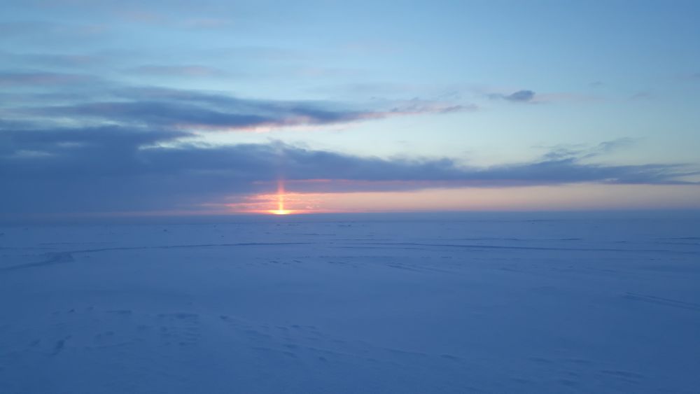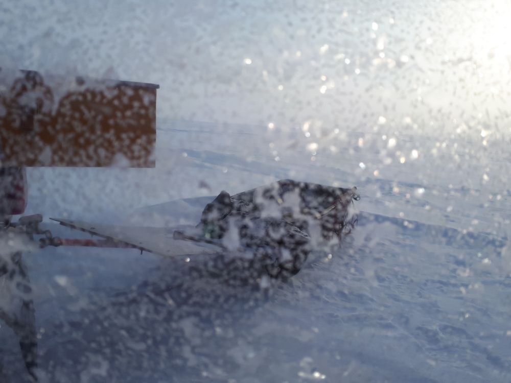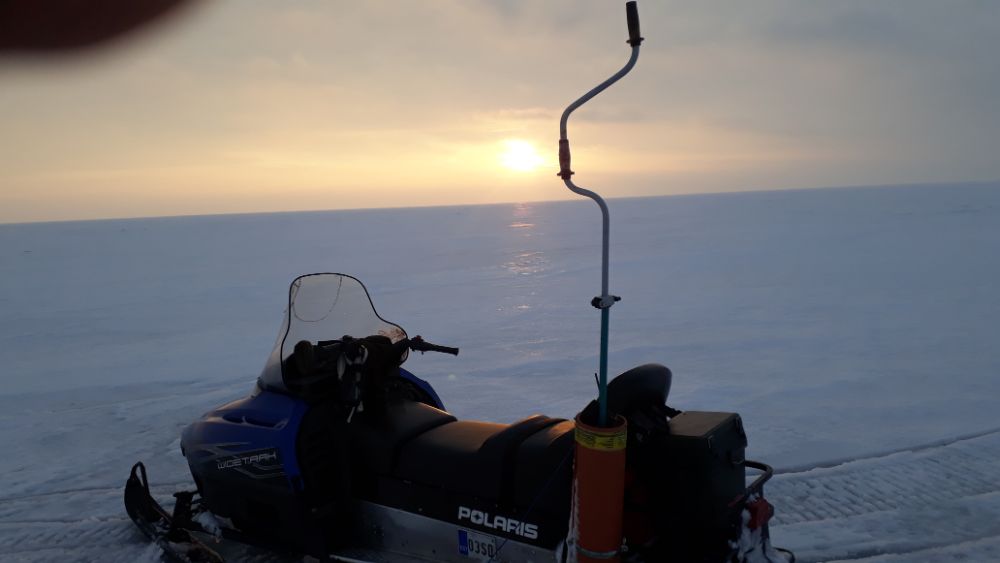 Не стал даже старые точки рассматривать , на попробовать , отметил направление к поворотному и решил без остановок , уехать что б поджопников не видеть .Выехал уже рассвело , первые развозки уже возвращались с озера , точки концентрации рыбаков понятны , я еду дальше оставляя далеко позади чёрные силуэты на льду.На горизонте показались хорошие торосы , которые при приближение просто с наскока не проскочишь , пришлось обьезжать . За ними проверил расстояние до поворотного , уже близко , народу вокруге не видно , следов на льду тоже , решил искать место для лунки . Не знаю как у кого , но у меня по моему первый год такой , что за всю рыбалку в день не больше пяти лунок делаю , рыба находится сразу и бегать практически смысла нет , да и по размеру практически везде одинаково , где больше где меньше, главное что б поджопников не было .