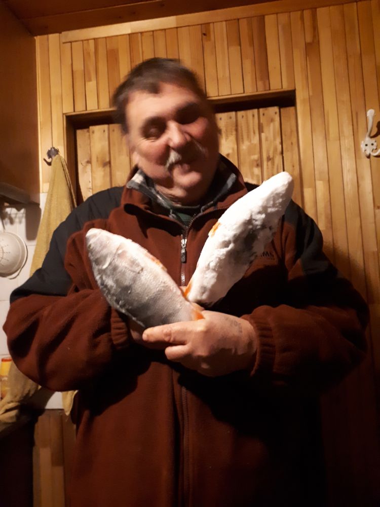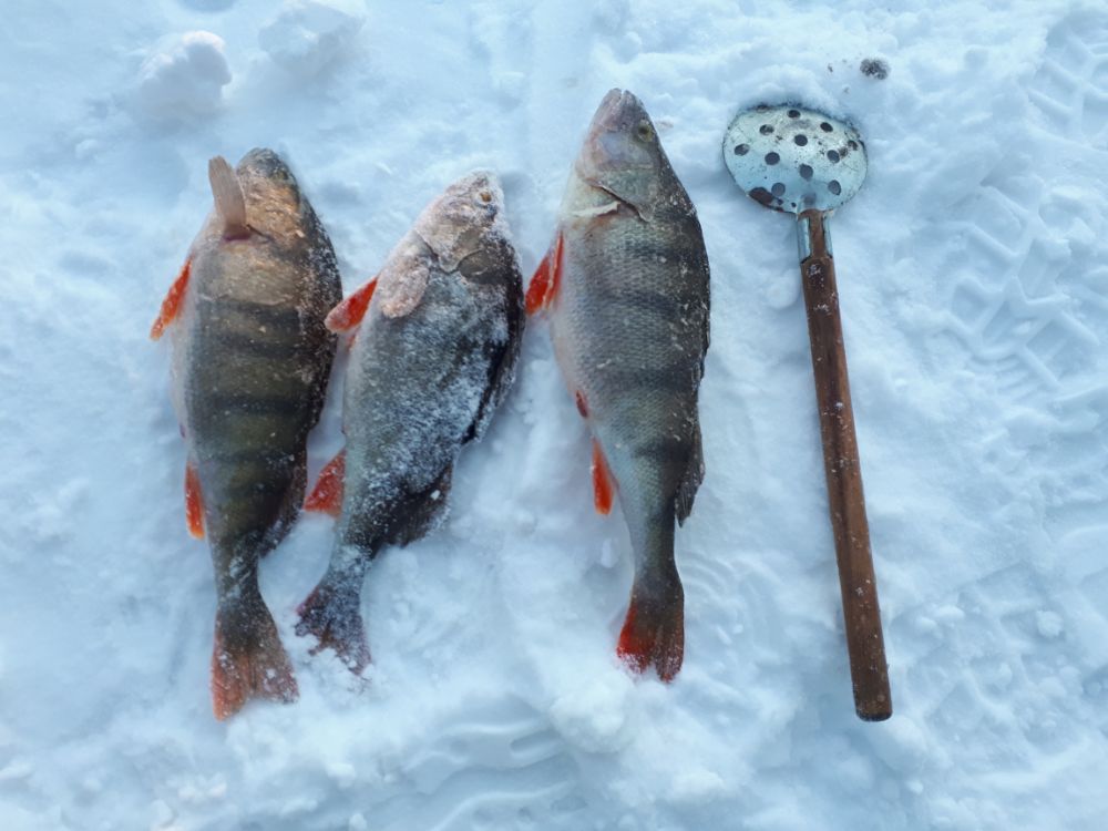 Первый день как уже писалось выше, решили от толпы сбежать да действительно так что в общем за два дня 140 километров накружили, ход не сказать что сильно тяжёлый, такой нормальный ход, во второй день образовалась снежная каша на льду и ход был потяжелее, но в общем то конечно нам это не мешает никогда. Поиски приносили не большие результаты, в основном конечно гликанистый окунь, садишся на лунку и считаешь до двадцати, на двадцатом окуне меняешь лунку , редко проскакивали и сьедобные батончики, но это как исключение, если бы брал всю рыбу то наковырялбы максимовский пакет точно, но так как брал только арбузиков то в первый день домой поехали только килограмма 3. На следующий день уже не сильно упирались и поэтому поехали на лунки где эти арбузики время от времени нас радовали. Второй день то ли погода менялась то ли ещё была кака я ни будь