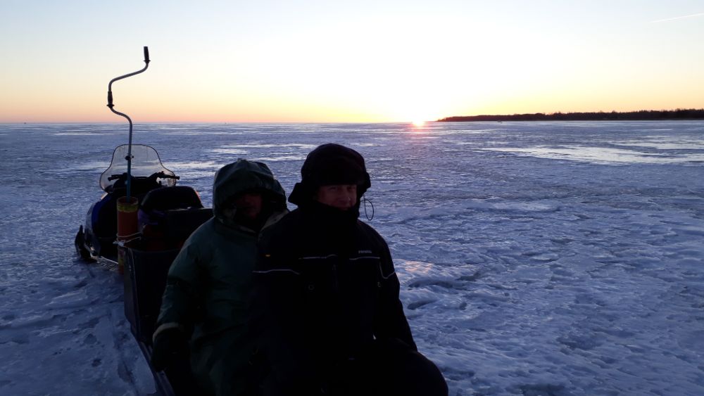 Вчера были в Варнья, рыбу пробовали ловить в промежутке 5-7км,за все годы рыбалки на Чуде поставили своеобразный рекорд по улову..... 😁, на двоих наловили аж, плотвы в количестве 4шт,окуня 7шт и удалось поймать такую для этих мест редкую рыбу как царь-рыба ЁРШ🤣-1шт, перед выездом на лёд местный сказал, что за день до нас плотва начала клевать после 15.00,мы усердно ждали часа X, но чуда не произошло, в итоге пришлось уехать ни с чем. Вкратце ситуация по льду- утром лёд сухой, но уж больно неровностей много, снегоходу явно такие условия не по нраву, вечером на обратном пути вдобавок к неровнастям на льду вода, пока доехали до берега, из под лыж постоянно брызгала вода, хоть и ехал медленно, по приезду на берег весь мокрый, даже через комбез вода прошла.