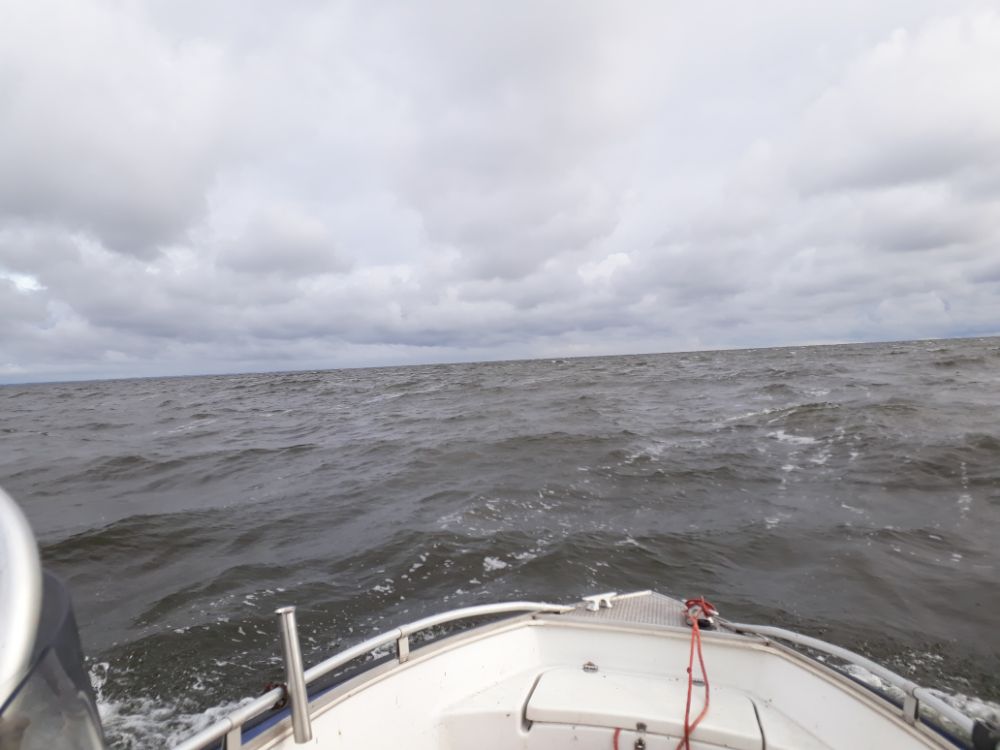 Соеденился , накачал грушей , завёлся , в полный ход , обороты скачут , ветер отжимной от берега , ну думаю заглохну , весел то нету , Россияне выловят , решил к берегу пока едет , дам прочихатся ,в сторону дома повернул , куда в озеро с таким идти . Ну вроде прочихалось , повернул опять на курс . На месте волна не хилая , малый якорь не держит , поставил другой . Пока переставлялся , спининг положил на консоль и концом на леер .