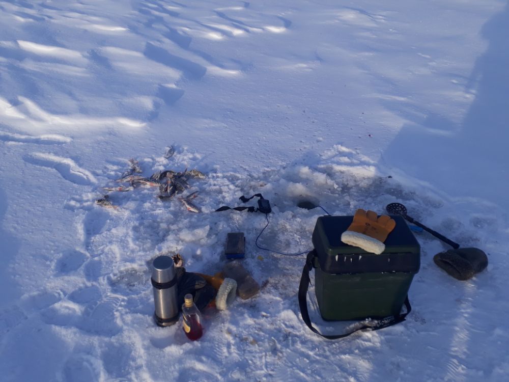 . Вот что значит сезон пропустить. Ещё пол км и хватит. На удивление поклёвки сразу, но размер... Почти всех в лунку. Меньше 100 гр. не брал, поэтому за весь день только 4 штучки. Зато получал кайф от погоды, морозца и практически полного безветрия. Да и поклёвок насмотрелся