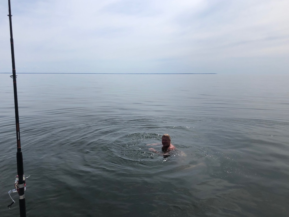 Вроде бы недобрый знак, но клёв продолжился и на втором и на третьем забросе - стало понятно что рыба присутствует. Ловил на джиг и мелкую резину 1,6-2", цвет салатовый и варианты машинного масла. В промежутках когда заходили паромы, уходил за мол где волны были поменьше и устраивал водные процедуры с катера - вода за эти дни прогрелась до +24С