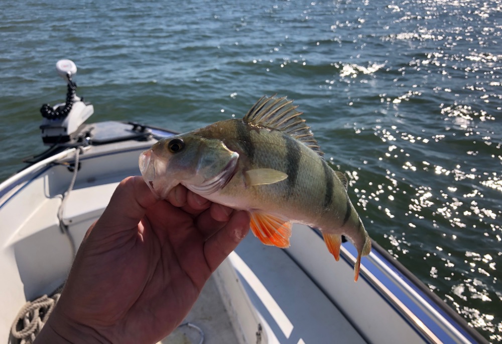 К обеду был на слипе. В берег пришли 2 лодки, разговорились, по рыбе плохо, вернулись они из под Вормси. Ну я далеко уходить не собирался, план был проверить акваторию вокруг порта. Встал на заходе в порт в стороне от фарватера, оснастил спиннинг, первый заброс - поклёвка и первый окунь в лодке