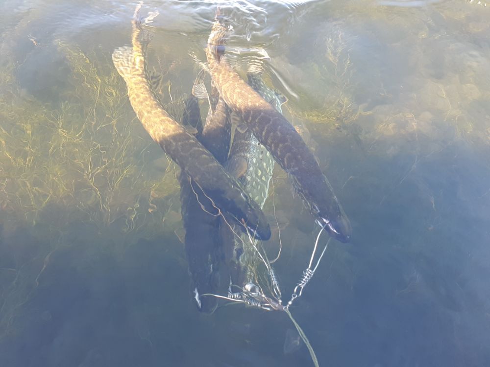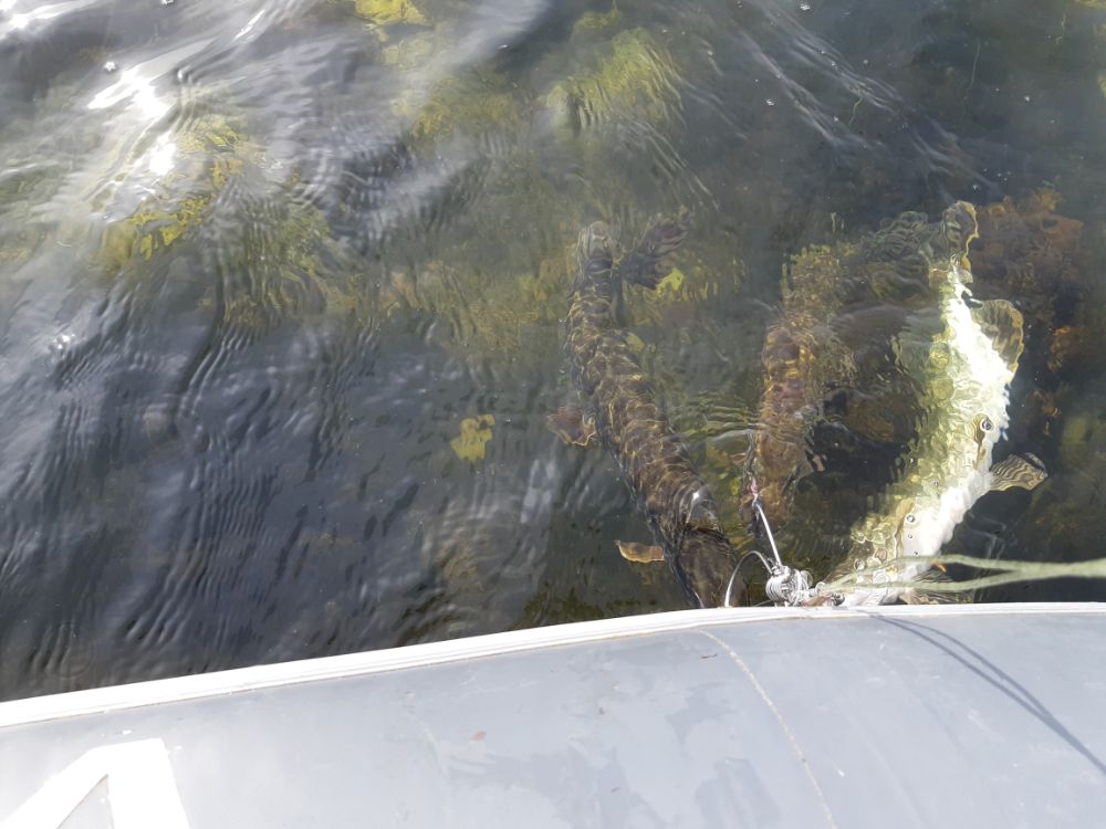 Что то стал я забывать, как щука в натуре выглядит. Всё тока в отчётах и вижу. Надо бы вспомнить было. Тут и случай подвернулся. ломанулись по указанному адресу в составе трёх человек. Погода класс. С утра чутка рябь на воде. Для зубастой самое то. Вот это ТО, в основном и случилось в то время пока рябь на воде была. А после обеда полный штиль. Приходилось щучку будить, звуком мотора. Дашь кружок по ранее обработанному месту, и снова поклёёвки. Из приманок работало в принципе всё. Но если на воблеры, слайдеры и т.д. поклёвки были мягкие, с догонялками, то на вертушку рубила так, что спин из рук вышибала. На ней родной пантуновской и остановился. Не. конечно пробовал менять в обратном порядке, но вертуху работала лучше. По крайней мере у меня. а может у меня просто резины не было правильного цвета