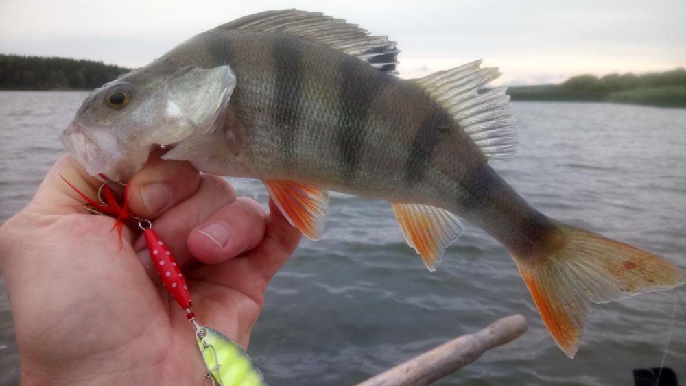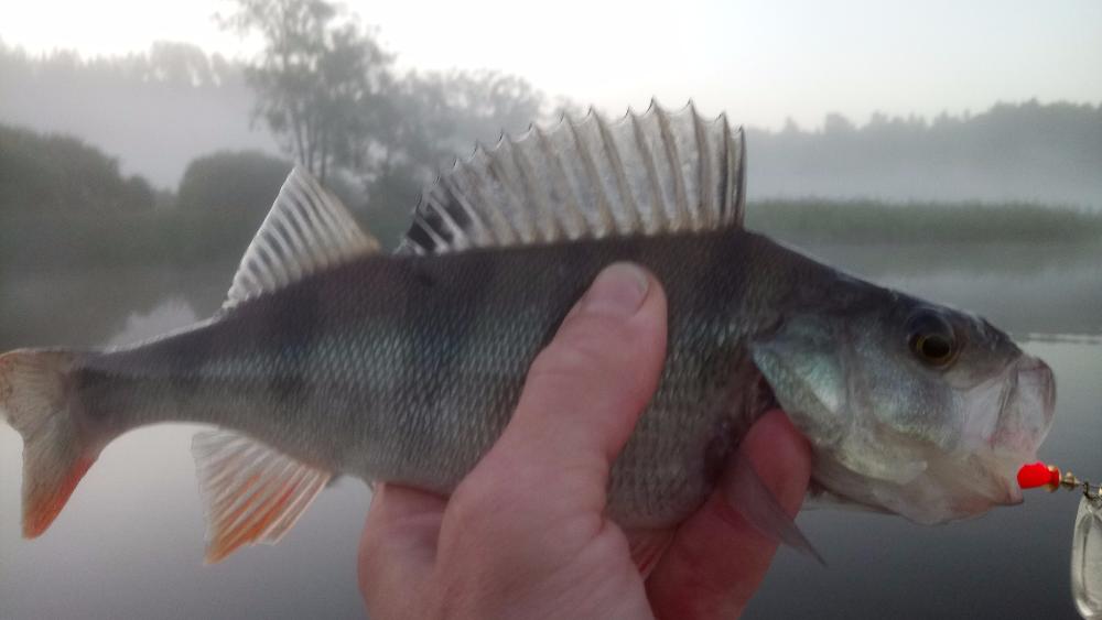Пара окушков. Решил пораньше уйти в берег, чтобы собрать лагерь побыстрее и уехать.