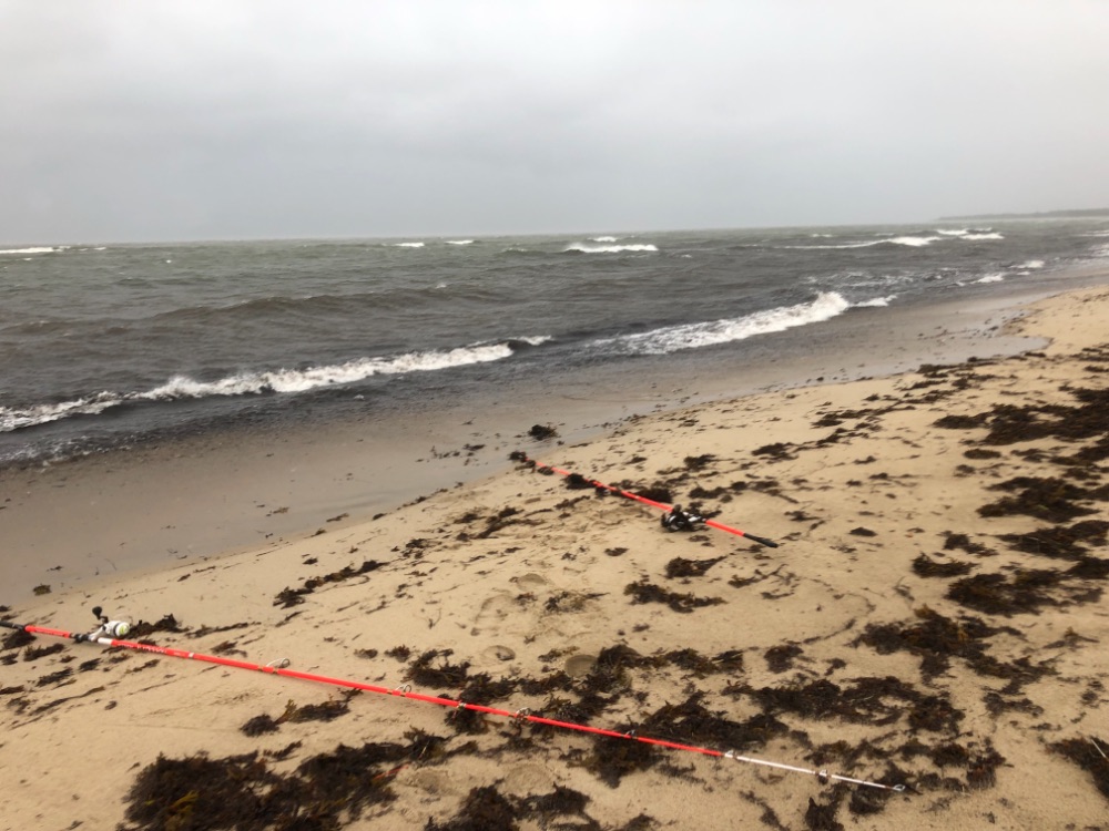 располагал их на самых высоких намытых местах куда волны уже не доходили. На прошлой неделе песок был слежавшийся и палку было трудно воткнуть. Вчера пляж весь поменялся, поднялся, намыло много песка и он был рыхлый. Палку загонял почти на половину и стояла она мёртво!