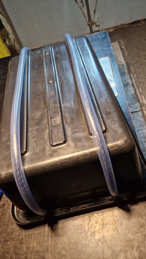 Вместо прикрученных накладок на новые санки, сделал съёмные. Прозрачная водяная труба пвх 25мм диаметром для полива, с характеристиками по замерзанию до -20 градусов. Она конечно тоже дубеет, но типа не разваливается при -20 и как-то ещё гнётся.