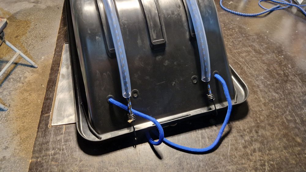 Протянул через трубки стяжку резиновую 10мм диаметром для фиксации груза в машине с крючками, просверлил в санках дырки под крючки и всё готово в тексте который пишу, а так да, слегка потрудился для фиксации стяжки через трубку.