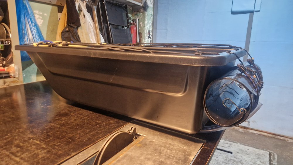 Нашёл куда в походном положении крепить подложку под санки. Сижу и думаю, если крючки убрать и крепить спереди резинкой, сделать две крышки, то туды чё нить можно будет запихать.