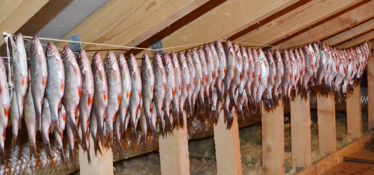 ЗЫ. Можно перед вывешиванием раскладывать на газеты и переворачивать время от времени, так подсыхает рыба гораздо быстрее и не течёт с неё обильно. Или (если крупняк) обтереть салфетками/бум. полотенцами.