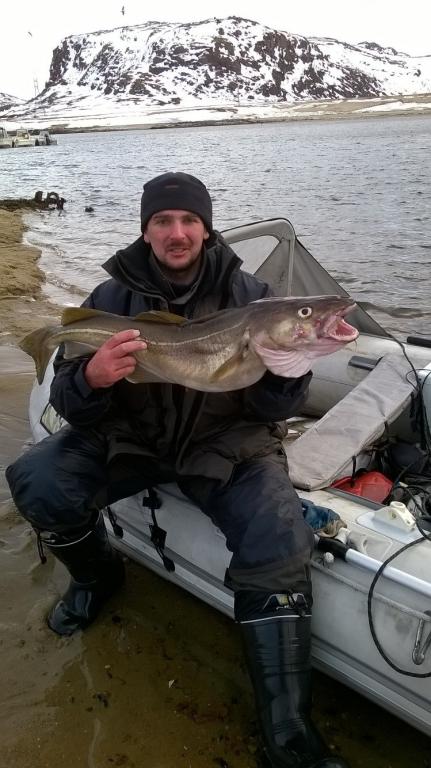 Всем Большой Привет !!! Удалось открыть летний сезон на Кольском. А точнее на Баренцевом море. Цель была , треска .... И нам это удалось. Погода особо не радовала, но денек половить дала. В сопках еще много снегу , местный народ ловит со льда на озерах кумжу и гольца. Перед въездом в поселок Тереберка , нас встретил ( местный гаишник, сборщик дани, Пугало для туристов), положив монетку на удачу , поехали разбивать лагерь.