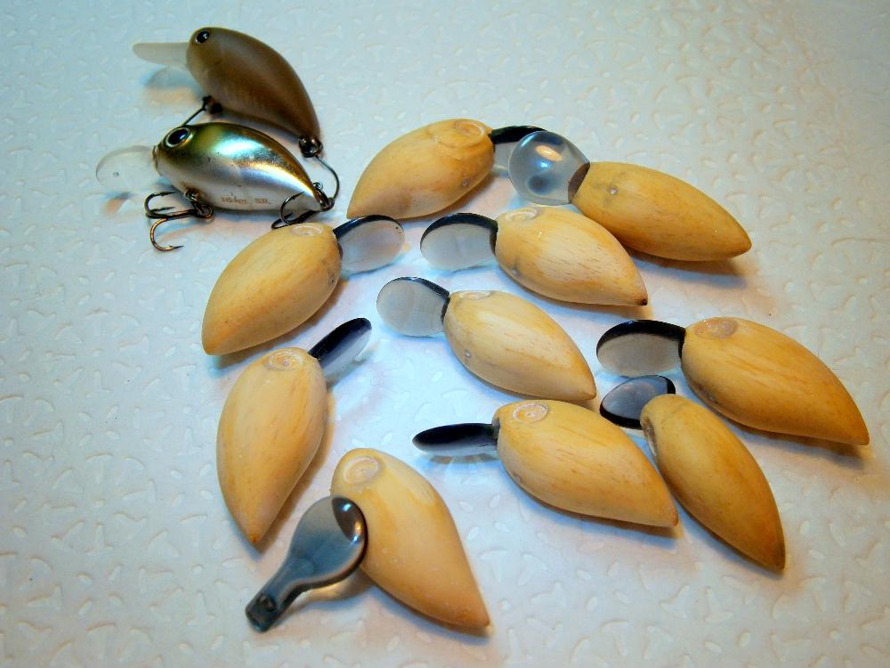 Долго отсутствовал, весной заболел, подхватил воспаление легких, летом лопата вылечила, строил у ребенка на огороде. Зима все заметает, вернулся к воблерам. Настрогал немного рабочих лошадок для себя. Похожих на Хикори, Чаббиков ,и каких-то еще толстячков, из головы, от себя, похожих и на первых, и на вторых)). Похожие на Хикори начал доводить до ума первыми. Пропитал "по горячему", как рассказывали и делают мастера (авв), Игорь (Istars) в джерках, Владимир (Stekloduv ), и другие. Готовые болванки из дерева "загрузил в маленькую печку, выставил температуру примерно 150 гр., час они грелись, приготовил нужный объем эпоксидной смолы, самой обычной (Дзержинск), старой – ей, наверное. лет 10-15, несколько начатых коробок лежали, пылились дома. Думал «мертвая», т.к. удивил цвет –компоненты все слишком светлые, прозрачные, на глаз отмерил в стаканчик. Открываю дверцу печки, мгновенно извлекаю болванку закрепленную на проволочке от гофры (протяжка для кабеля) , в брюшке, в будущем месте петельки-скрутки. И в стаканчик со смолой, кисточкой обмазал - излишки потом сдул феном, правда феном перегревал слегка – смола побелела. Повесил, кисть помыл в 646-м. Просто, быстро, не трудоемко, эффективно. Прошкурил, (часа через четыре - пять, уже. А думал смола мертвая – нет, все нормально) после высыхания (полимеризации) смолы. Лопасти по шаблону из поликарбоната 2мм, отполировал, врезал в болванку под нужным углом. Дримеля у меня пока нет, канал под лопасть (глубиной 6-7 мм) делал обычной маленькой дрелью. Два отверстия – примерно 1,2-1,3 мм, этим же сверлом удалил перемычку, расширил. Надфилем полукруглым довел до нужного размера.