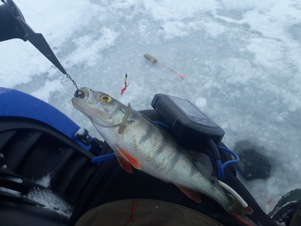 Главное на рыбу попал , но она не хотела ответной любви , в прошлые выхи до 12 вообще показания рыб не видел на эхолоте , тут же вот она рыба , а не берет, с час промучался уговаривая , что только не предлагал , не в какую. Чуток переехал и начал собирать активных , и главное пяток с лунки , потом вроде он есть ,но не берет , новая лунка и пяток активных. Что напрягло , лед местами 7см. . Но что самое классное ,народу ни кого, даже на горизонте и звуков ни слышно.
