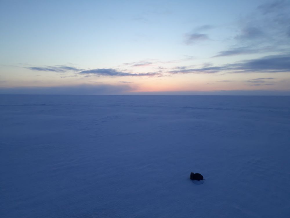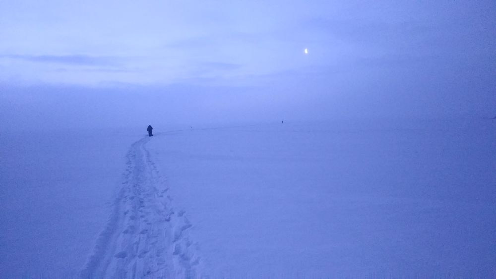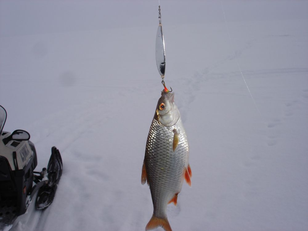 Сань, сегодня видимо день не клёвый. Вчера 17 килограмм, сегодня там же 8. Имею ввиду размер 100+. Малышей, тех можно на одной лунке целый день таскать. Хотя, кто попал, подловили. Вывод: надо оторвать задницу с насиженного места и удариться в активный поиск. Правда осложняется тем, что всё покрыто снегом. Даже намёка на пятнышки нет.