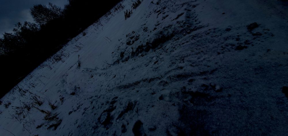 Вырвал буквальо 5 градусов правее столбиков и пробив спресованный снег с бордюра полетел вниз метров на 8-10. Сел на брюхо, буксую и стоит на месте. Звоню Саше, хватаю пластиковую лопату и начинаю копать спресованный снег наверху что бы при вытаскивании глушитель не отрвать.