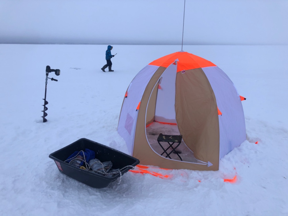 Я разбил палатку над своими лунками недельной давности и сделал ставку на усиленный закорм. Рыбка конечно клевала, но не сильно, на перекуры времени было предостаточно