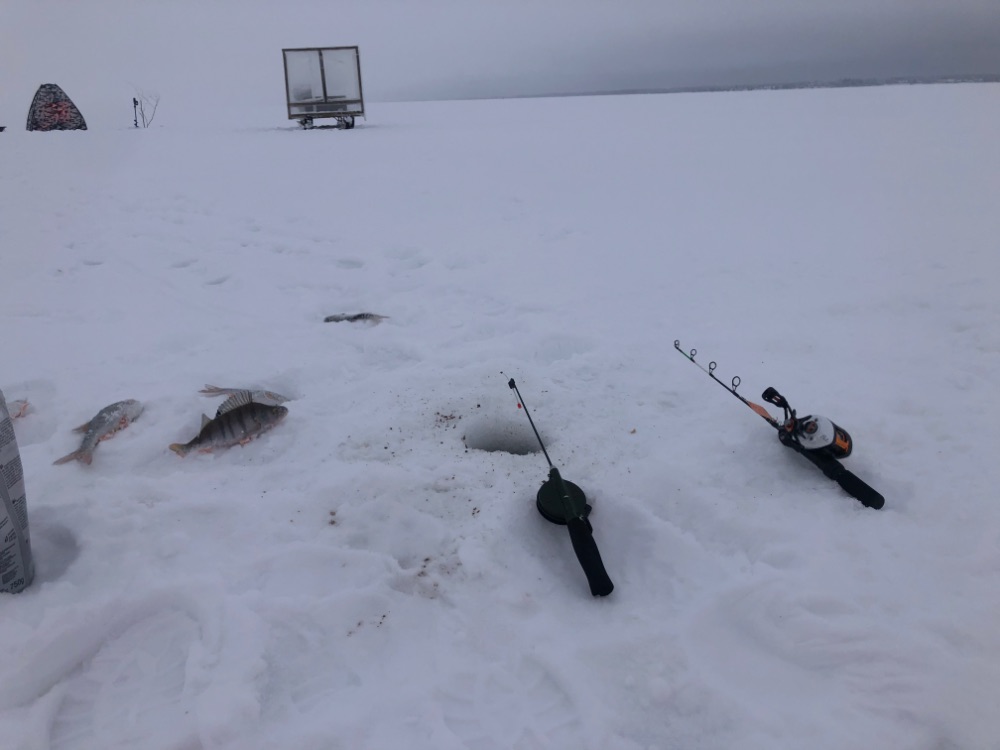В воскресенье всё стало течь, снег начал превращаться в кашу, на льду было много воды. В понедельник это безобразие продолжилось, но прогноз сулил послеобеденный минус с восточным ветром. И на этот раз синоптики не ошиблись - к обеду действительно стало задувать, да так, что пришлось впервые применить растяжки для палатки. Точка молчала примерно до 10, после этого, в одно мгновение, началась раздача всех раздач! Клевало на всё сразу, как из пулемёта! Мы не успевали перезабрасываться, - жадные поклёвки следовали одна за другой на все снасти. Реально темп был такой, что не было времени ни то что чаю попить, даже телефон достать из кармана не удавалось. День пролетел как 5 минут, 5 сумасшедших минут. Было много потерь в плане снастей - рыба порой их запутывала, но при таком клёве времени на их распутывание не было, они нещадно резались, бороды удалялись, а под конец ловля шла уже на пустые шпули, а на бороды внимание вообще не обращалось. Да и дно, ввиду нехватки лески, становилось уже недосягаемым, но рыба продолжала клевать даже в двух метрах от дна. Это была настоящая раздача по плотве!