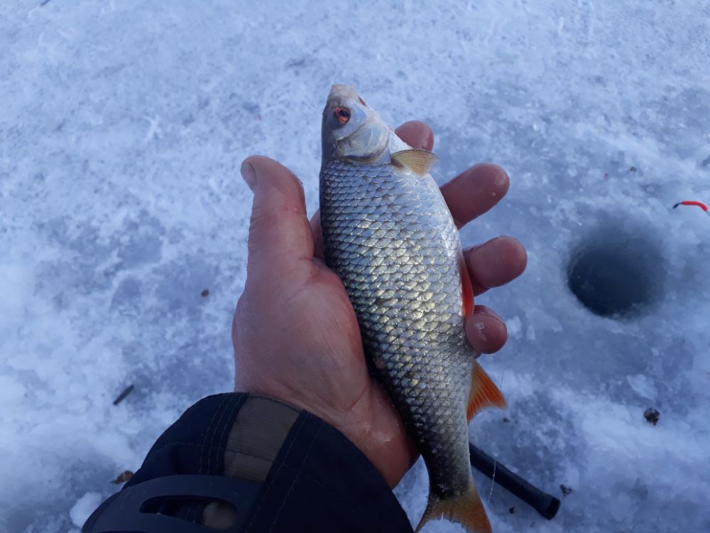 . Погода с утра просто песня , не верилось в то что предрекали после обеда. На точке сделал лунки и чуток помедитировал с блесной , потом проверил на наличии плотки , отозвались ерши , потом бах и плотка, решил кормить и делать лагерь , уже наездился за прошлые выхи .