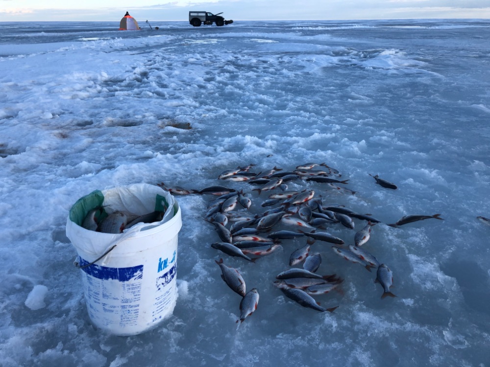 Погода на много лучше, ветер сменился на западный, довольно сильный, палатка на растяжках. Сели на лунки, но клёва нет. Решаю проверить свои вчерашние лунки и уже на первой получаю уверенную поклёвку - первая плотвичка на льду. И вот тут началось то, что называется Чудской лифтинг, раздача, порево, бешенный клёв как из пулемёта - в общем всё то, ради чего мы все едем на Чудо! Поклёвки следовали одна за другой, размер рыбы радовал. Лишь когда поклёвку приходилось ждать более 6 секунд, я переходил на следующую лунку и всё начиналось с новой силой. Тем временем у сына дела тоже шли в гору, из ведра виднелись приличные тушки, ловлю он вёл на мормышку. Но после того как я наглядно продемонстрировал ему как за тоже время на донку ловятся 4 рыбы вместо одной на мормышку, он без раздумий перешёл на голые крючки с 7-ми граммовой свинцовой каплей - дела после этого у него пошли гораздо веселее.