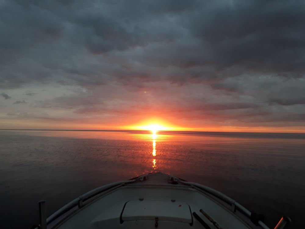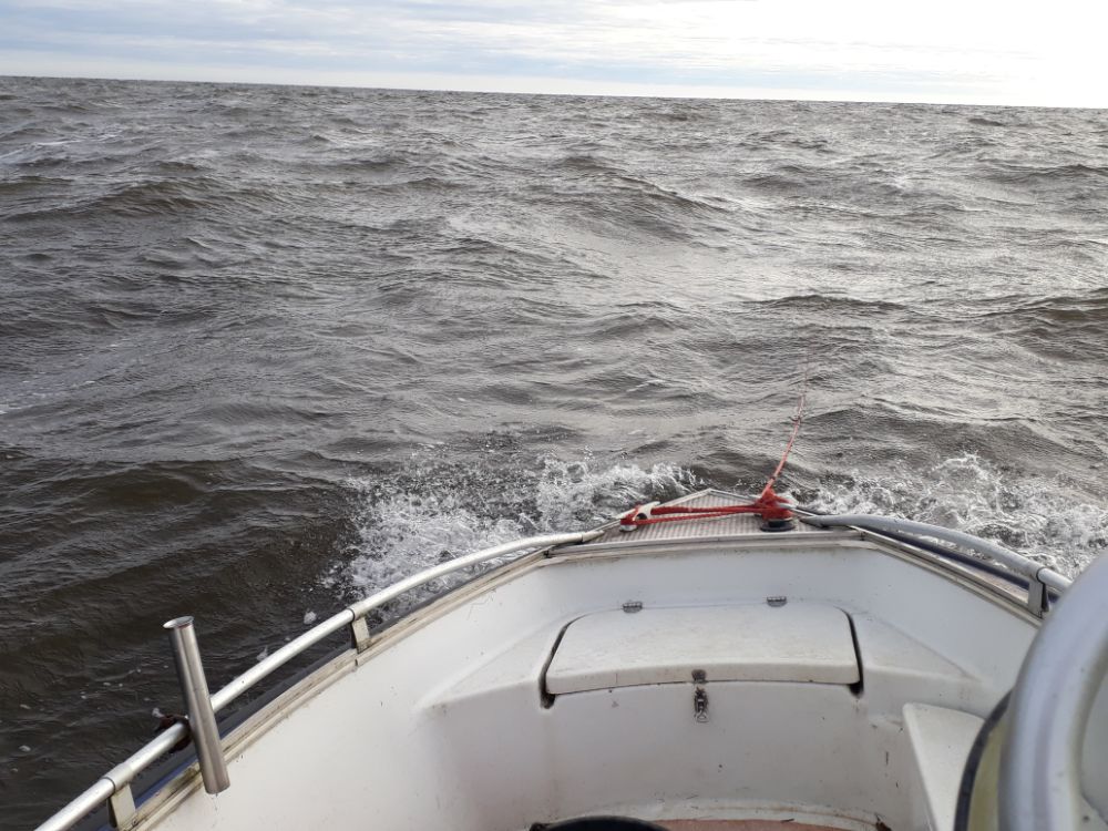 В эту субботу , ветер 7 метров чистый восток , думал не ходить , но встав утром решил попробовать выйти . Ход только в водоизмещающем режиме , иногда чтоб взобратся на волну добавляешь газу, до точек ловли 6 км , на первой точке пару поклевок , перемещаюсь на пару км. благо лагом идти , можно и ходу прибавить, там вообще тишина , еще пару мест , тот же результат , рыба закрыла рот , плюс подразбило стаи , поупирался еще малехо , да и до дому , дрова складывать.
