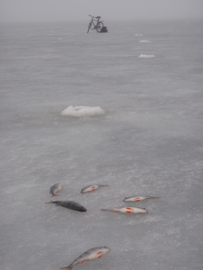 Этой ночью было -2. До 10 часов вытерпел этот зуд в пятой точке,в 10.30 был на льду. Не большой минус всё же сделал своё доброе дело и подморозил корку в пару сантимов на 30 сантиметровом игольчатом льду. К сожалению правильная рыба была не в курсе что я опять припрусь и до 14 часов так и не появилась. Пару десятков недоподлещиков были скормлены чайкам.