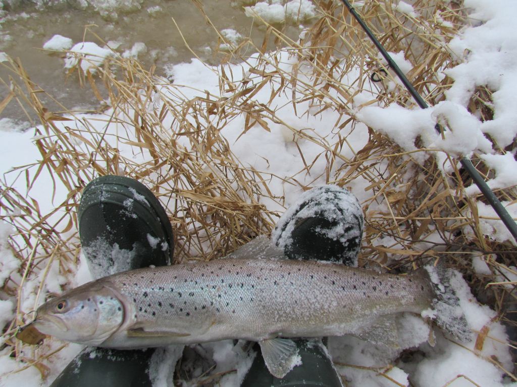 на неё,а ледок по краю совсем тонкий - рыба проламывает