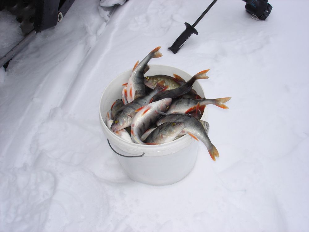 Суббота, погода дрянь, оттепель внесла свои коррективы, на льду под снегом стоит вода, техника с санями еле ползла. Рыба была не очень активна, в основном не крупный окунь, к 14 часам даже мотыль его не возбуждал.