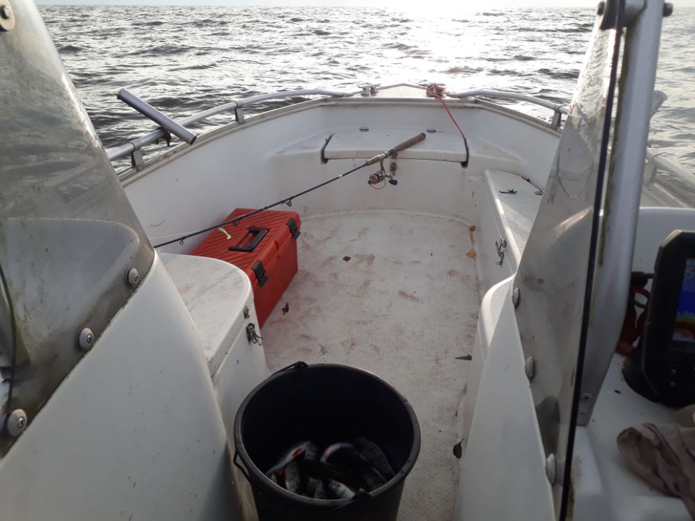В эту субботу , начало , пока солнце не вышло , поклевки одна за одной , но размер ниже среднего , потом , по одному и то с разных направлений , стаи просто нет , смена мест ни чего не изменила , пробовал на малом ходу в сторону дома , найти скопление рыб в течении полу часа , не за что было глазу зацепится , что то грустно нынче , парни выходили в восресенье у двух экипажей и в разных местах и разному подходу к рыбалке , результат одинаковый.