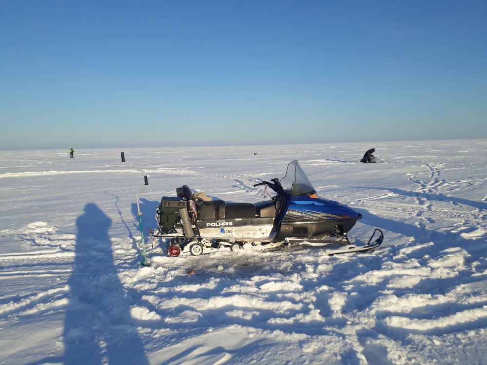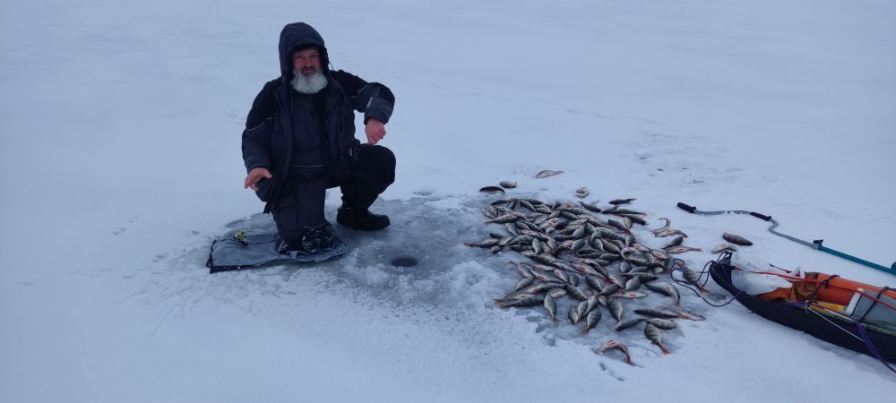 Были в районе Алаые, лёд 10 см, снега на нём тоже около 10 см, где поменьше, где побольше. Погода не подвела. Первые поклёвки увидел только в 12-ом часу, окунь вялый, пришлось поперебирать железки. Запрет на передвижение на технике не для местных сетевиков, у них уже полно сетей наставлено, даже рыба с белыми жабрами в сетях встречается. Отлично отдохнули, ещё вернёмся!