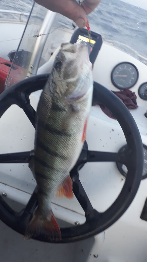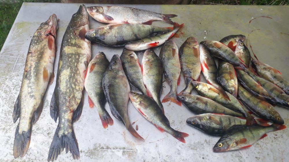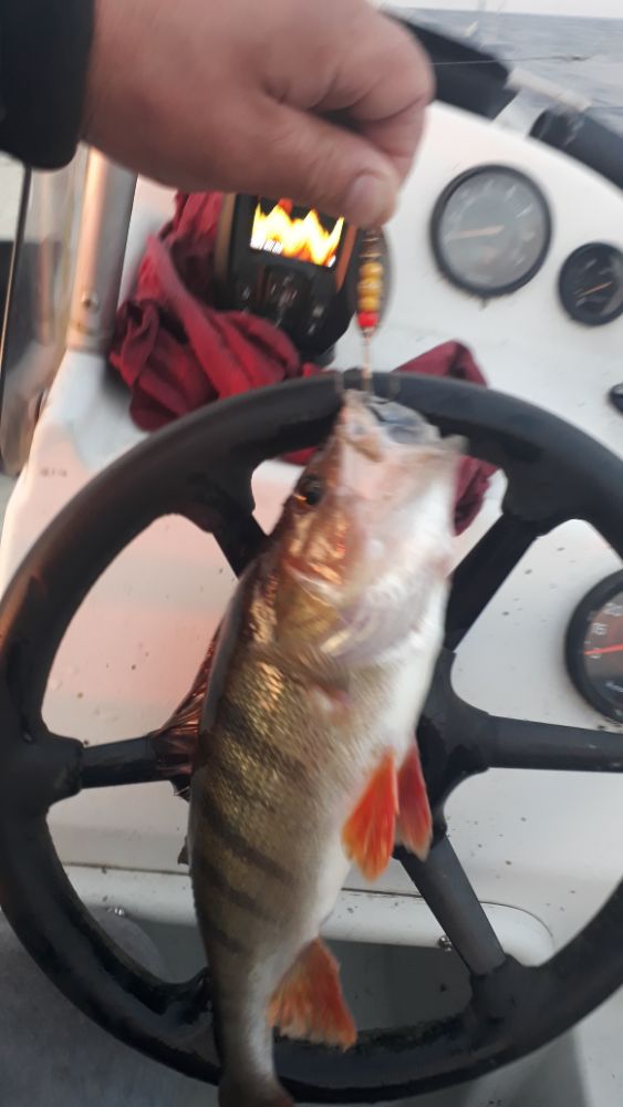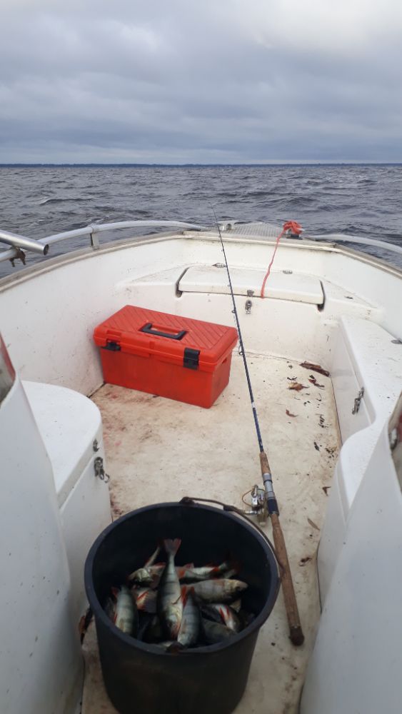 Вчера поинтереснее. Окунь проскакивает приличного размера, грамм по 500-600, щука цепляется регулярно. Правда размер мелковат. Взяли парочку килошек, остальное за борт. Правда было пару сходов хороших. Или окуни килограмовики или щуки покрупнее.Погода не подкачала. С утра маленько побрызгало, потом сухо, лёгкий ветерок и под конец солнце. Клёв не прекращался пока не уехали. Можно было сидеть до вечера.