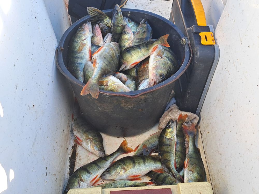 В субботу порыбачили компанией. Опять просидел на одной лунке. А фигли бегать, если клюёт. Погранцы на подушке подходили. Разрешение на выход проверили. Затем инспекция была, то же проверили. Кстати штраф за нахождение без регистрации 800 евро. Окунь как обычно, мелочи много, пришлось фильтровать более жёстко. )) Время пролетело быстро. Но замечательно.