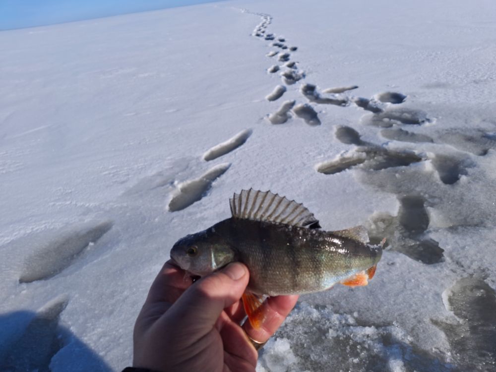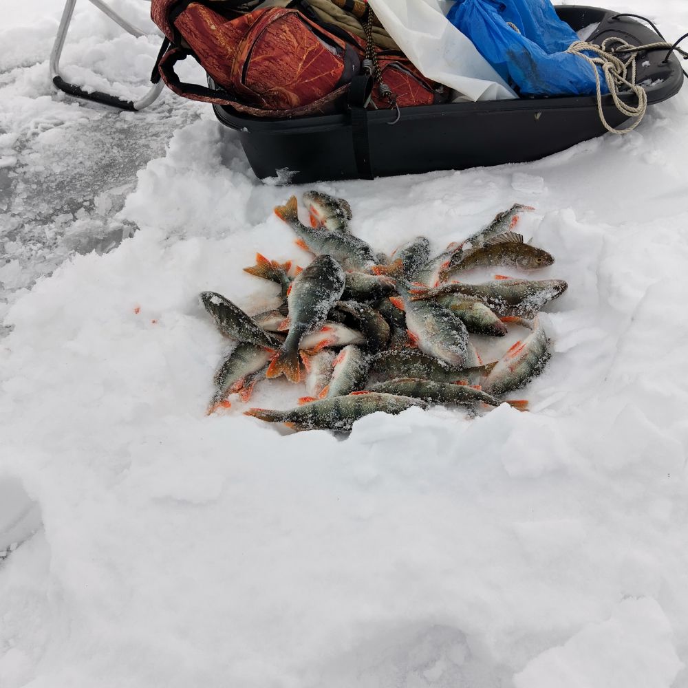 Несмотря на то что нагулял по озеру больше десятка км и насверлил черте сколько лунок, стайного окуня найти не удалось, средняя уловистая лунка это пара окушков. Мелочи до ста грамм в этот раз почти не было, в основном 120-200 грамм и все трудовые.