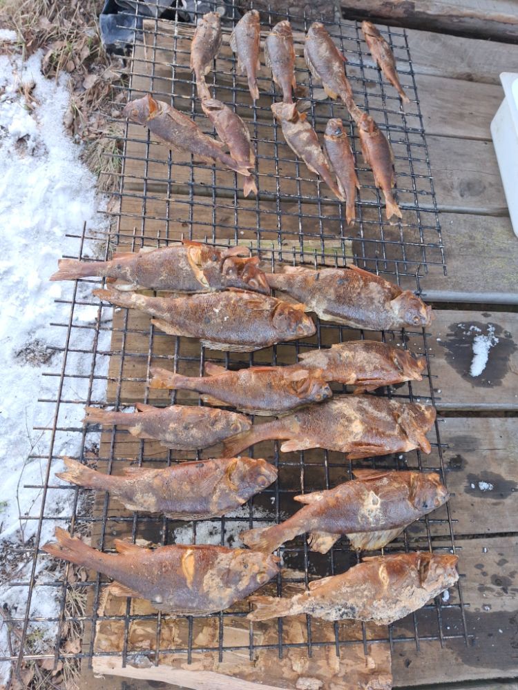 Да, здоровье уже не то. Раньше добежать до 7-8 километра вообще не проблема. Сейчас до второго дотопали и язык на плече. Стареем, однако. Потому решили закрыть сезон не напрягаясь. Не напрягаясь это 200-300 метров. Глубина 3 метра, но рыбка есть и неплохие проскакивают. Так два дня неторопясь в удовольствие порыбачили. На фото субботний улов, отфильтрованный 150+. 8 килограмм. В воскресенье поменьше. Да и в берег уже в 12 отправились. Хватит. Решено на позитиве сезон закрыть. Если будет возможность до 15 марта лучше щучку по открытой воде погонять.