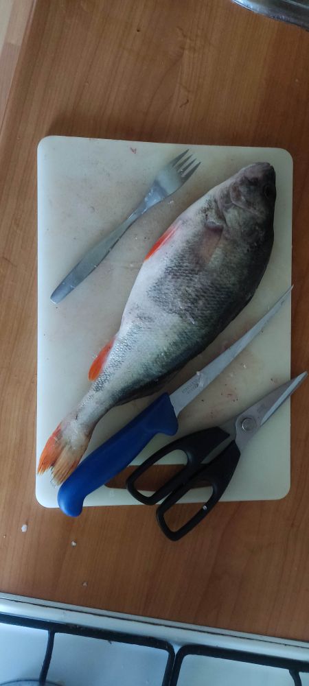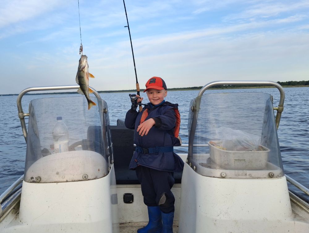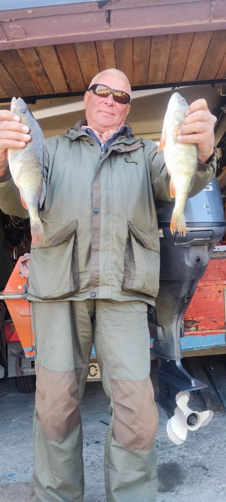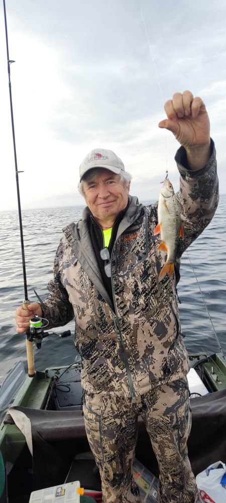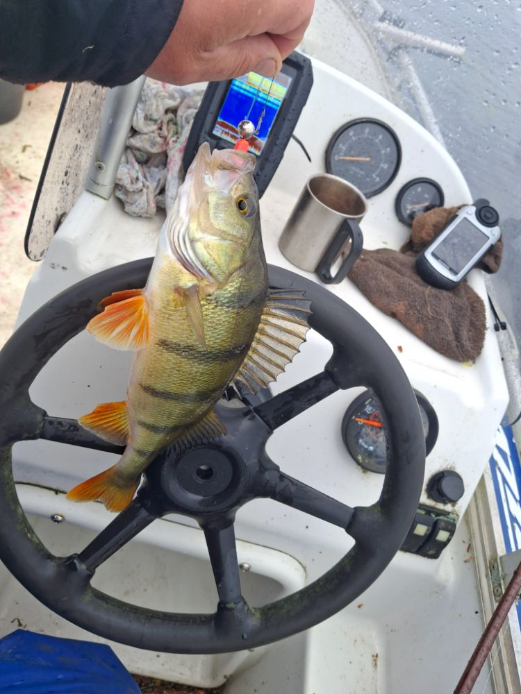 Начали поиск два км от берега, закончили на четвертом. Обновил новый костюм, подышал чистым во́здухом, половил рыбку. Клёв был не особо активным, только после полудня активизировался на час-полтора. Мелочи до 100 грамм отпустил штук 50. Потом вытащил зубастую на 4,6 кг. Повезло, ещё бы сантиметр и леска пришлась бы на зубы. Сел пообедать, а окуни не давали